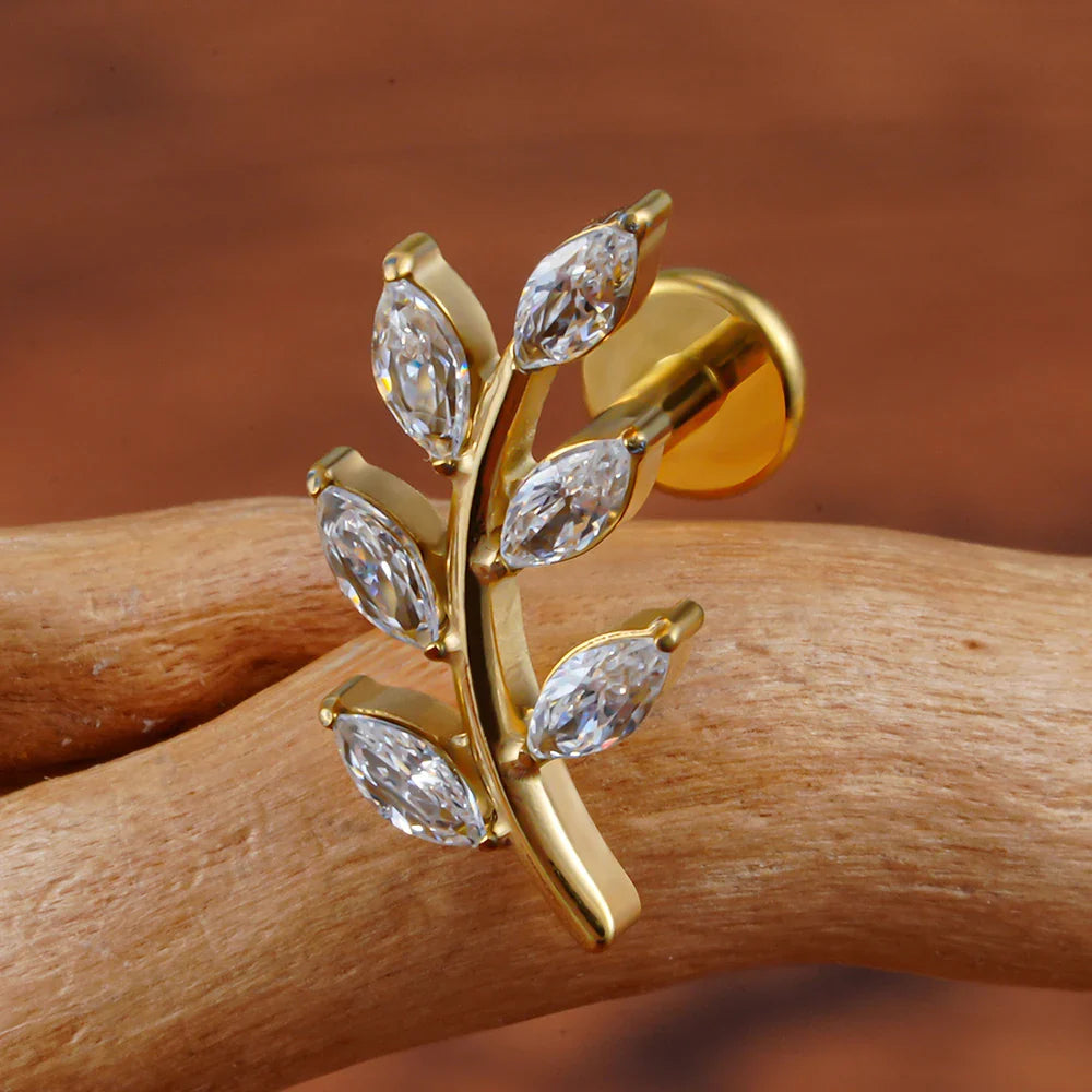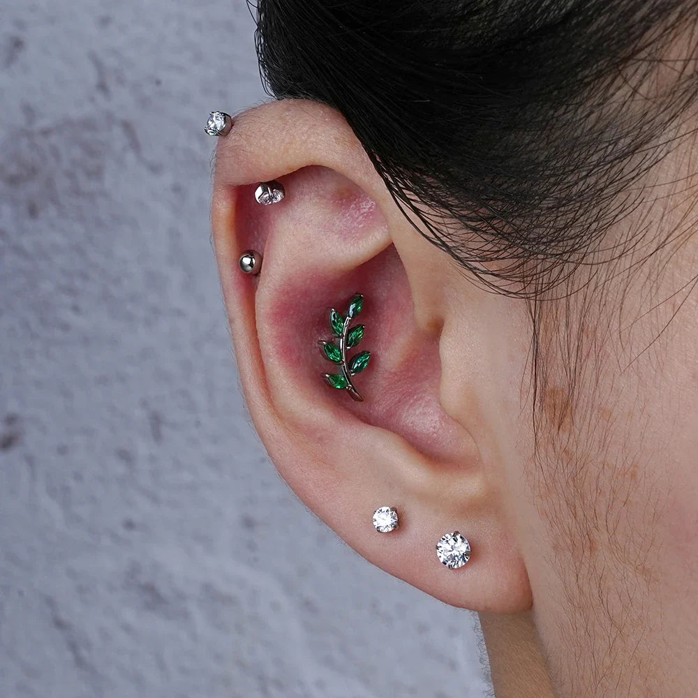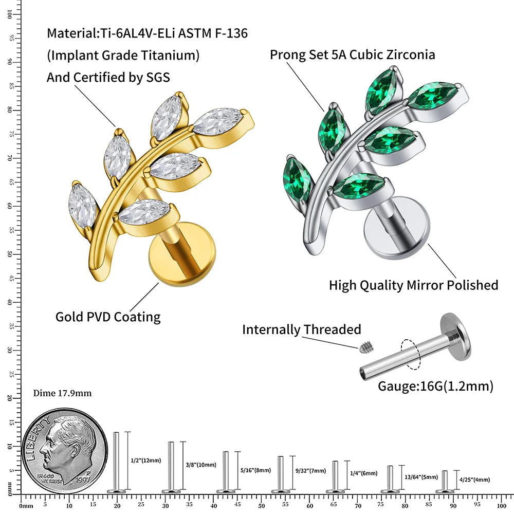 Orecchino a foglia con diamante, titanio, foglia, naso, perno, piercing all'elica, conchiglia, 6 perni a foglia